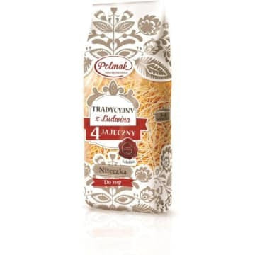 Niteczka firmy Polmak , jak sama nazwa wskazuje to cieniutki, delikatny makaron, który po ugotowaniu wręcz rozpływa się w ustach. Wytwarzamy go w oparciu o dawną, sprawdzoną recepturę. Jest to makarom 4-jajeczny, do którego produkcji używamy maki pszennej typu 450. Tradycyjny sposób wytwarzania, odpowiednie proporcjei jakość składników sprawiają, że nasz makaron ma wyjatkowy, delikatny smak i oryginalną konsystencję. Niteczka firmy Polmak idealnie nadaje się do zup, będzie doskonałym dopełnieniem dodmowego rosołu.